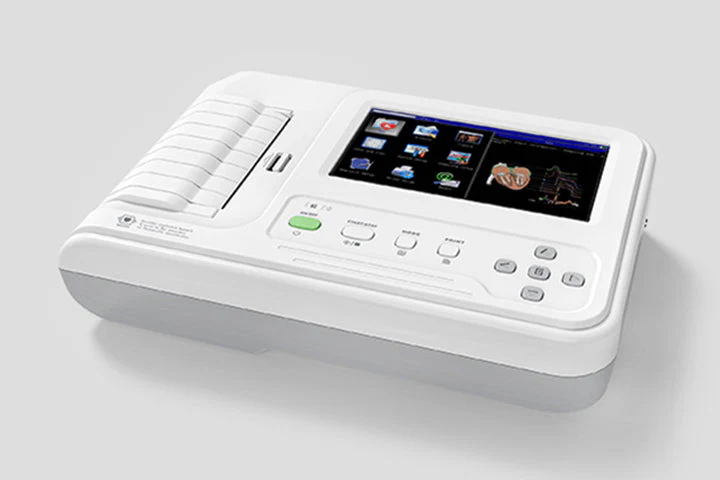 - Displays 3/6/12-lead ECG and system alerts (“Lead off”, “Lack of paper”).